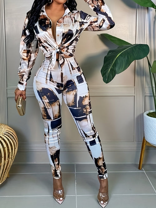 Elegant Gingham Printed Long Sleeve Square Neck Two-Piece Set | Button Details, Regular Fit, Suitable for All Seasons